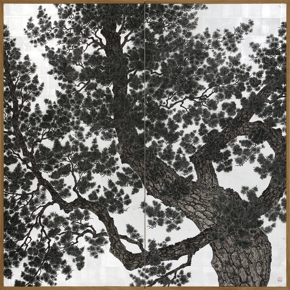 「これもひとくちで言うのは難しいですね。視覚的違和感とでも言えばいいでしょうか。線がちょっと太いだけで違和感を覚えることがあります。自然は雑多に見えて、細部を見たらすごいメカニズムでできています。そこからはずれた絵は、必ず違和感を覚えます。全体のリズム感を整えるために、あるていどのデフォルメはしますが、自然の秩序をはずれないよう一線をわきまえないといけません」(左作品『雄松天昇図』)